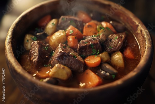 A hearty bowl of beef stew with tender meat and colorful vegetables, rich in flavor and warmth.