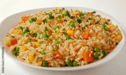 A hearty, vibrant meal featuring rice pilaf with chunks of vegetables and herbs.
