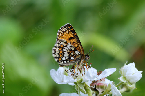 A Heath Fritillary Butterfly nectering on a Bramble flower.