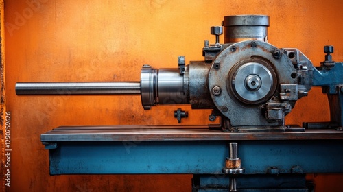 A heavy-duty lathe machine shaping metal on a bold orange background
