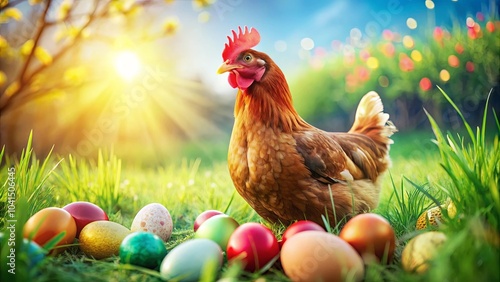 A Hen's Nest of Springtime Delights, Surrounded by Vibrantly Colored Eggs Amidst a Lush Green Meadow and a Sun-Kissed Sky