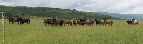 A herd of horses runs through the pasture against the background of mountains and blue sky. Panoramic shooting, banner for your advertising.Wild horses run across the field