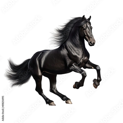 a high quality stock photograph of single jumping satisfied happy black horse full body isolated on a white background