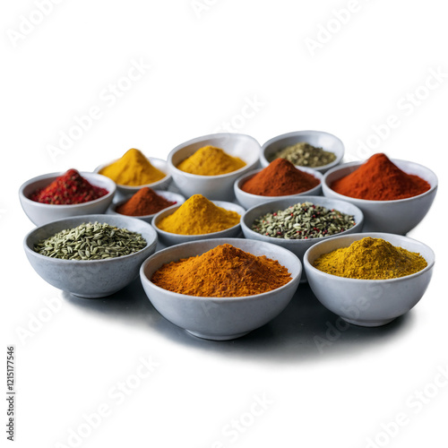 A high-angle shot of colorful spices arranged in bowls, taken in soft natural light, with a blurred tablecloth background.