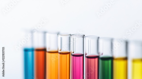 A high-resolution close-up of a set of medical test tubes with colored liquids, against a white background, Minimalist style