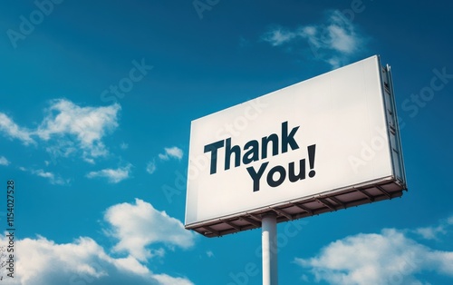 A high-resolution image of a white billboard with "Thank You!" written in black, positioned against a serene blue sky with a few clouds, in a photorealistic style.