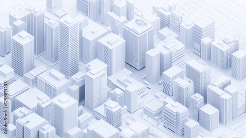 A high-resolution isometric cityscape displaying a network of modern skyscrapers, high-rise buildings, and urban infrastructure in a pristine white-gray palette