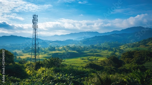 A high-speed telecom tower placed in a lush valley, framed by a bright blue sky, symbolizing the advanced technology flourishing in harmony with nature.