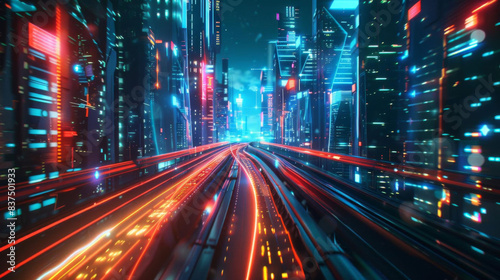 A highspeed train moving through a futuristic cityscape at night, leaving a vibrant light trail, ultradetailed, dynamic motion, highresolution