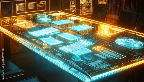 A high-tech courtroom table with glowing digital documents and holographic projections,