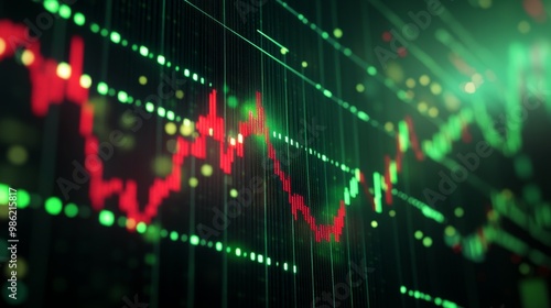 A high-tech financial graph in green and red, displayed on a large digital board, representing stock market performance and economic growth.