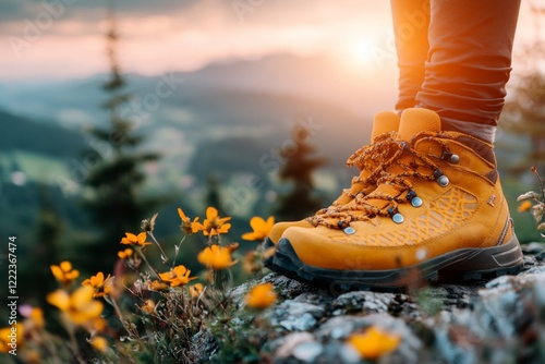A hiker calmly tying their shoelace on a cliff edge, their relaxed focus reflecting confidence and steadiness in a high-pressure setting