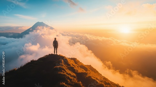 A hiker stands on a mountain peak, overlooking a sea of clouds and a vibrant sunrise, with distant peaks in view.