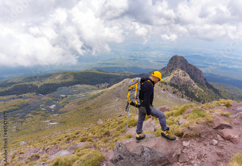 A hiker with a backpack standing on the top of the mountain