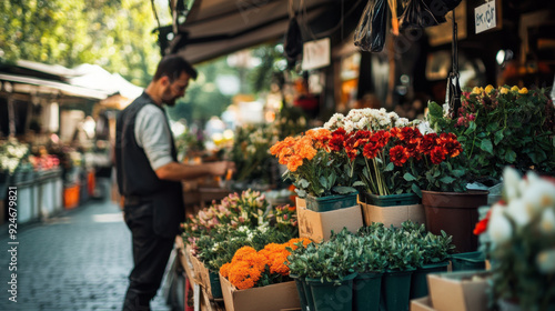 A historic European market with a vendor at a charming stall selling fresh flowers and seasonal