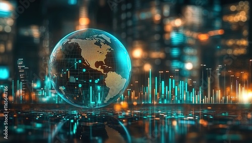 A holographic globe with global stock market charts glowing in the background