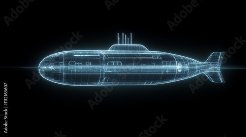 A holographic projection of a futuristic submarine with glowing portholes and smooth, streamlined features, hovering on a black background with faint water-like ripples, Photorealistic