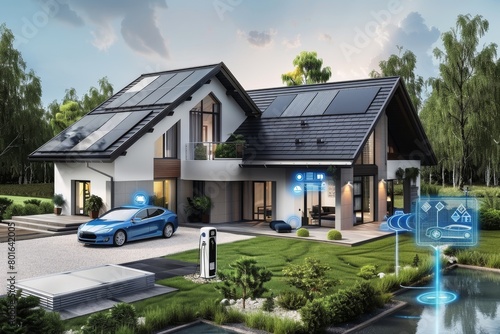A home displaying various energy saving features like smart lights solar panels and an electric car.