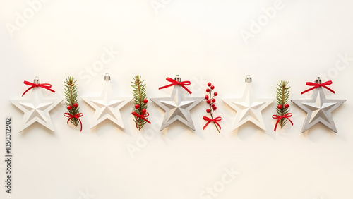A horizontal row of white and silver star-shaped Christmas ornaments with pine sprigs and red berries hanging on a light background. Ideal for holiday and festive concepts.