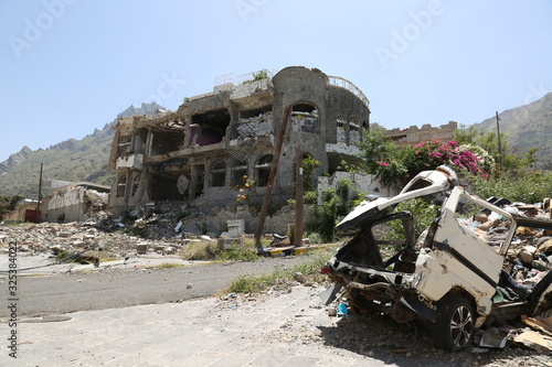 A house completely destroyed by war and fierce fighting in the city of Taiz, Yemen