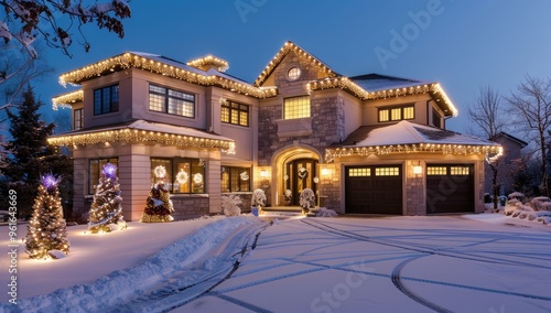 A house with lights and snow on the roof, front view of a garage door lit up at night, a parking lot full of cars, white walls, snow covering the ground, a winter scene