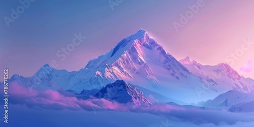 A huge mountain peak topped with snow is illuminated at the tip, set against a background gradient of blue and pink.