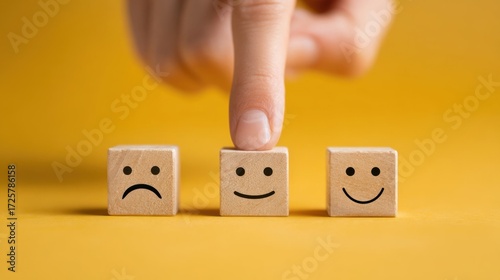 A human hand choosing a wooden cube with a neutral face among happy and sad options, placed on a bright yellow background representing emotional choice or feedback.