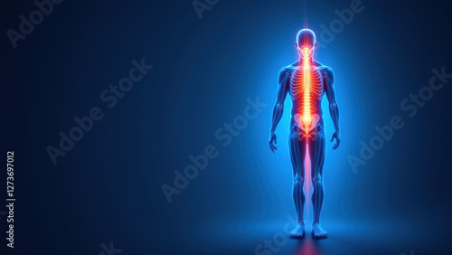 A human model with transparent skin revealing a detailed illustration of the internal anatomy, highlighting the central nervous system and specifically the vagus nerve for educational purposes.