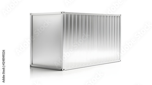 A image of a metallic shipping container with a reflective surface illuminated by soft lighting and isolated on a pure white background The clean