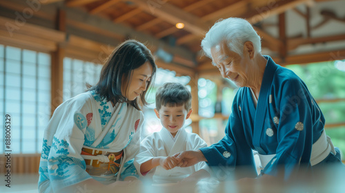 a Japanese family practicing traditional martial arts together in a dojo, with the grandparents guiding the younger members in techniques, Families in Japan, Japanese culture, ever