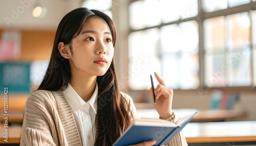 A Japanese schoolgirl gazing thoughtfully while journaling on her lap