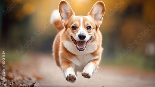 A joyful Corgi running toward the camera with its ears flapping and a big grin.
