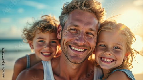 A joyful father takes a close-up selfie with his two smiling children at the beach, capturing a beautiful sunny day filled with happiness, warmth, and the special bond they share by the sea.