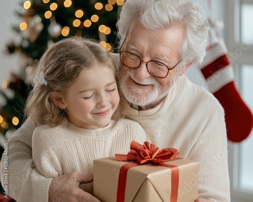 A joyful grandfather and granddaughter share a heartfelt moment while holding a beautifully wrapped gift in a festive, cozy setting.