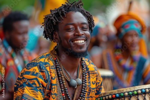 A joyful man drums with passion, his beaming smile captivating his outdoor audience, dressed in fan-like clothing