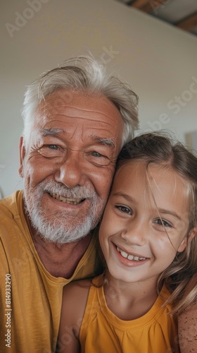 A joyful moment captured between a smiling older man with a white beard and a young girl with a radiant smile both wearing yellow tops sharing a warm embrace.