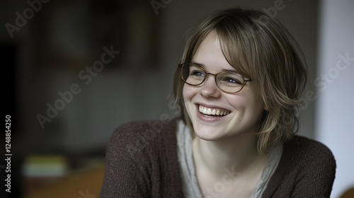 A joyful woman smiles warmly, radiating happiness and positivity.