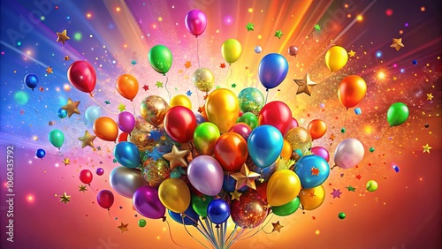 A jubilant explosion of colorful balloons, sparkling confetti, and golden stars against a vibrant, radiant background.