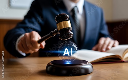 A judge's gavel striking a sounding block with a glowing AI symbol, representing the legal implications and ethical regulations of technology