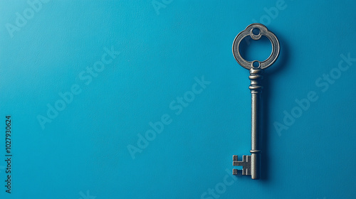 A key against a blue background, symbolizing safety and data protection in digital and cyber contexts.