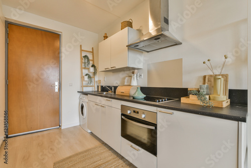 a kitchen with white cabinets and black counter tops on the floor in front of the door is an oven, dishwasher and sink