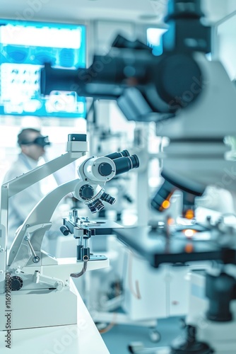 A lab scientist in white coat working at a microscope with various equipment around him.