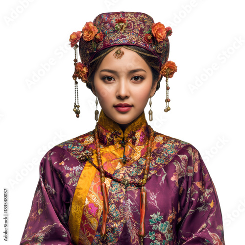 A lady of the Dynast: A lady adorned in an intricate gown, her face reflecting a serene poise and grace, her attire representing a culture