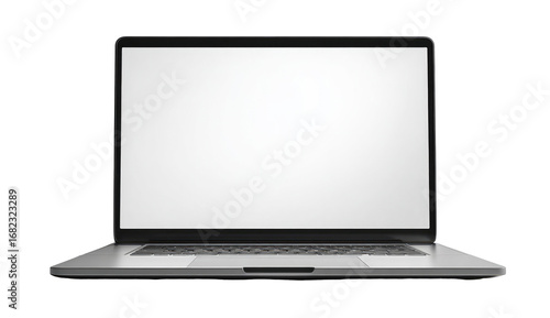 A laptop computer with a blank screen. Gray metal body, and a rectangular screen. Front-facing view