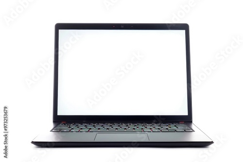 A laptop computer with a white screen on a white surface, suitable for business or technology concepts