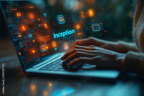 A laptop with glowing icons and the word "Inception" displayed on the screen. Hands are typing on the keyboard
