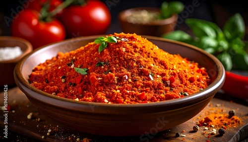 A large bowl of vibrant red spice blend