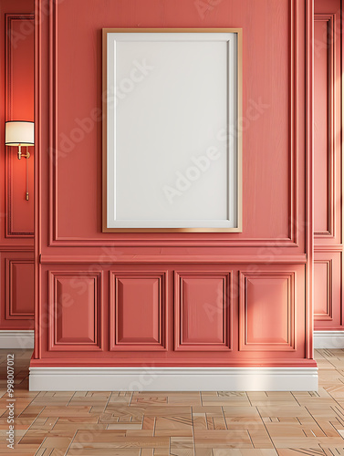 A large, empty picture frame hangs on a coral-colored wall with intricate molding. The frame is surrounded by a warm, inviting glow.