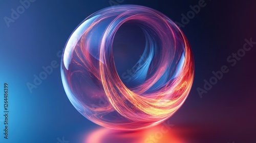 A large, glowing, colorful sphere with a blue background. The sphere is surrounded by a bright orange glow, giving it a sense of movement and energy. The blue background adds a sense of depth