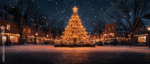 A large holiday light display shaped like a Christmas tree. The lights shine brightly in the center of a town square, Generative AI